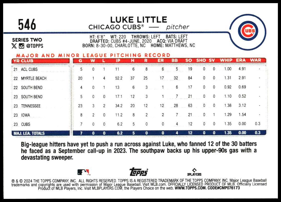 This Baseball card, from 2024 is part of the Topps Series 2 card set. Luke Little is featured and has a card number of 546.