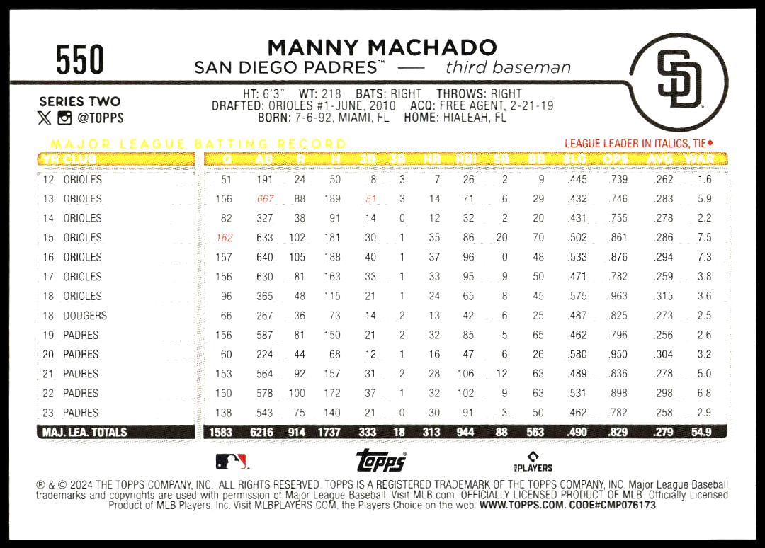 This BaseballΒ card, from 2024 is part of the Topps Series 2Β card set. Manny Machado is featured and has a card number of 550.