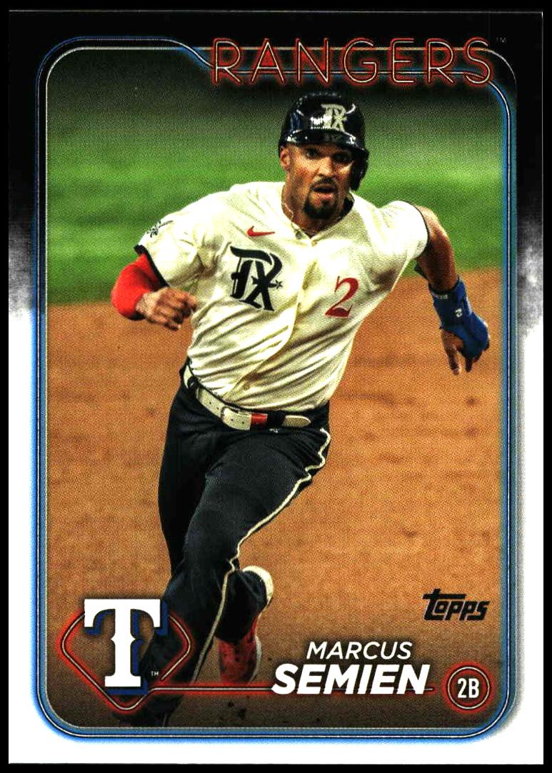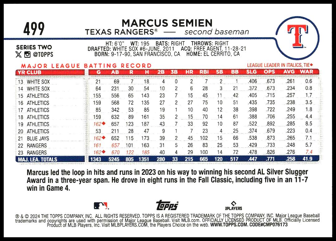 This BaseballΒ card, from 2024 is part of the Topps Series 2Β card set. Marcus Semien is featured and has a card number of 499.