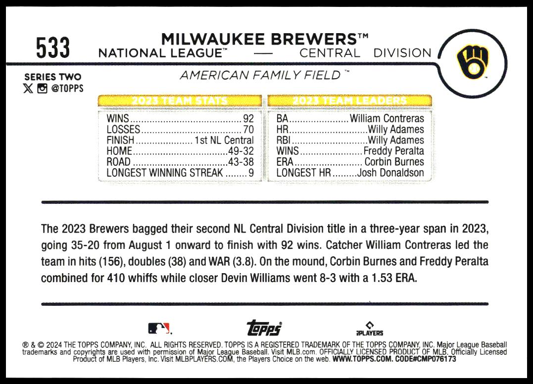 This Baseball card, from 2024 is part of the Topps Series 2 card set. Milwaukee Brewers is featured and has a card number of 533.