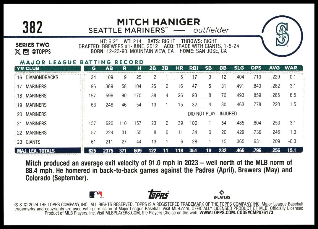 This BaseballΒ card, from 2024 is part of the Topps Series 2Β card set. Mitch Haniger is featured and has a card number of 382.