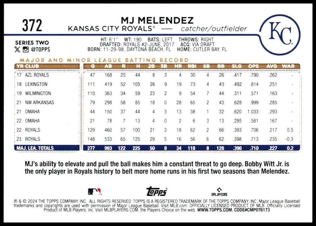 This BaseballΒ card, from 2024 is part of the Topps Series 2Β card set. MJ Melendez is featured and has a card number of 372.