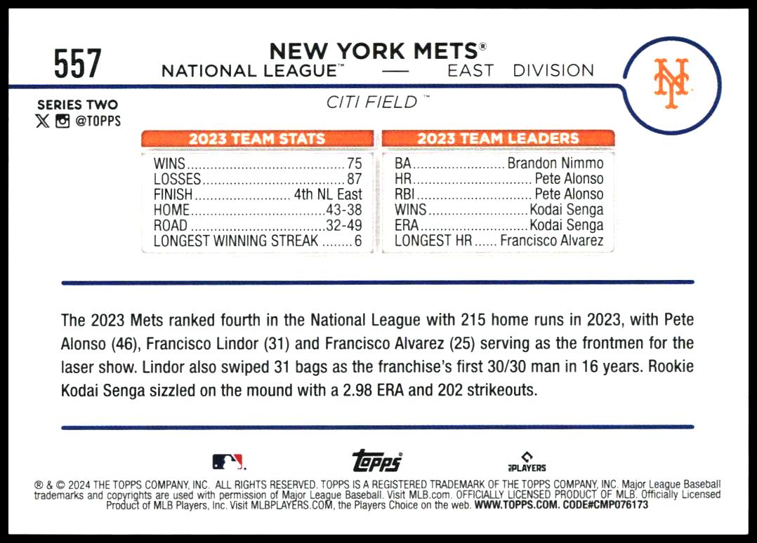 This BaseballΒ card, from 2024 is part of the Topps Series 2Β card set. New York Mets is featured and has a card number of 557.