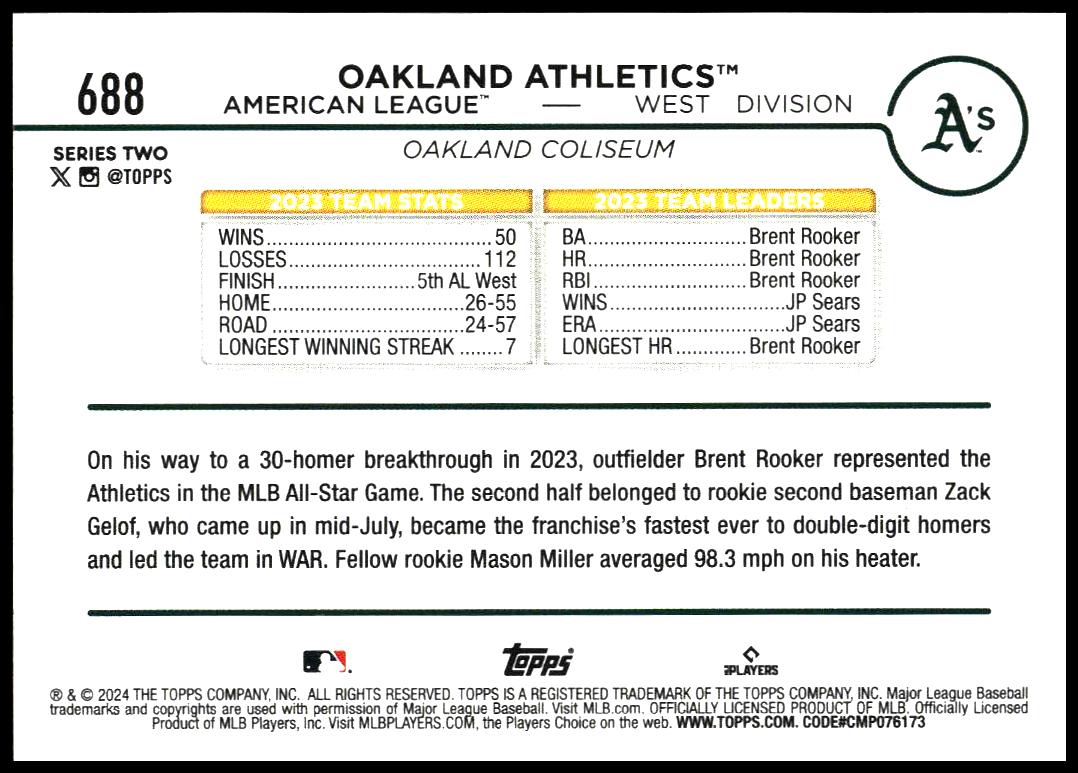 2024 Topps Series 2 Oakland Athletics #688