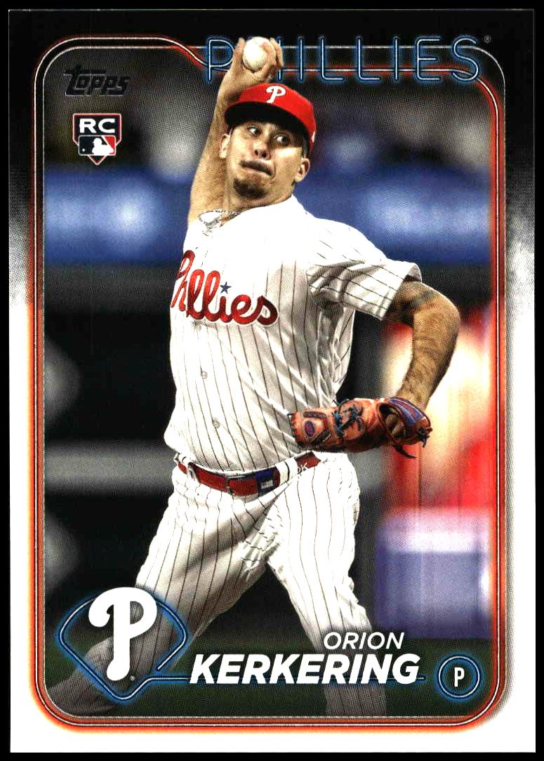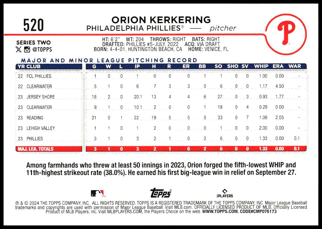 This Baseball card, from 2024 is part of the Topps Series 2 card set. Orion Kerkering is featured and has a card number of 520.