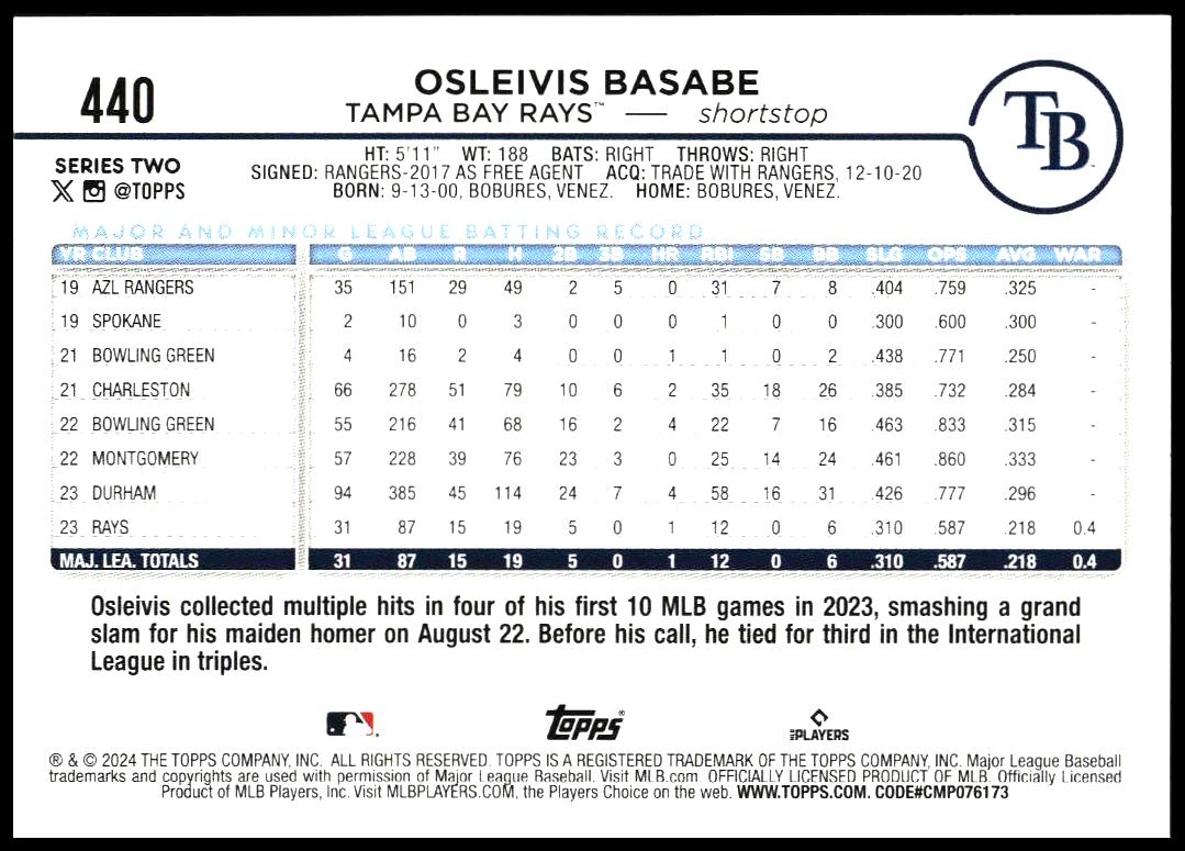 This BaseballΒ card, from 2024 is part of the Topps Series 2Β card set. Osleivis Basabe is featured and has a card number of 440.
