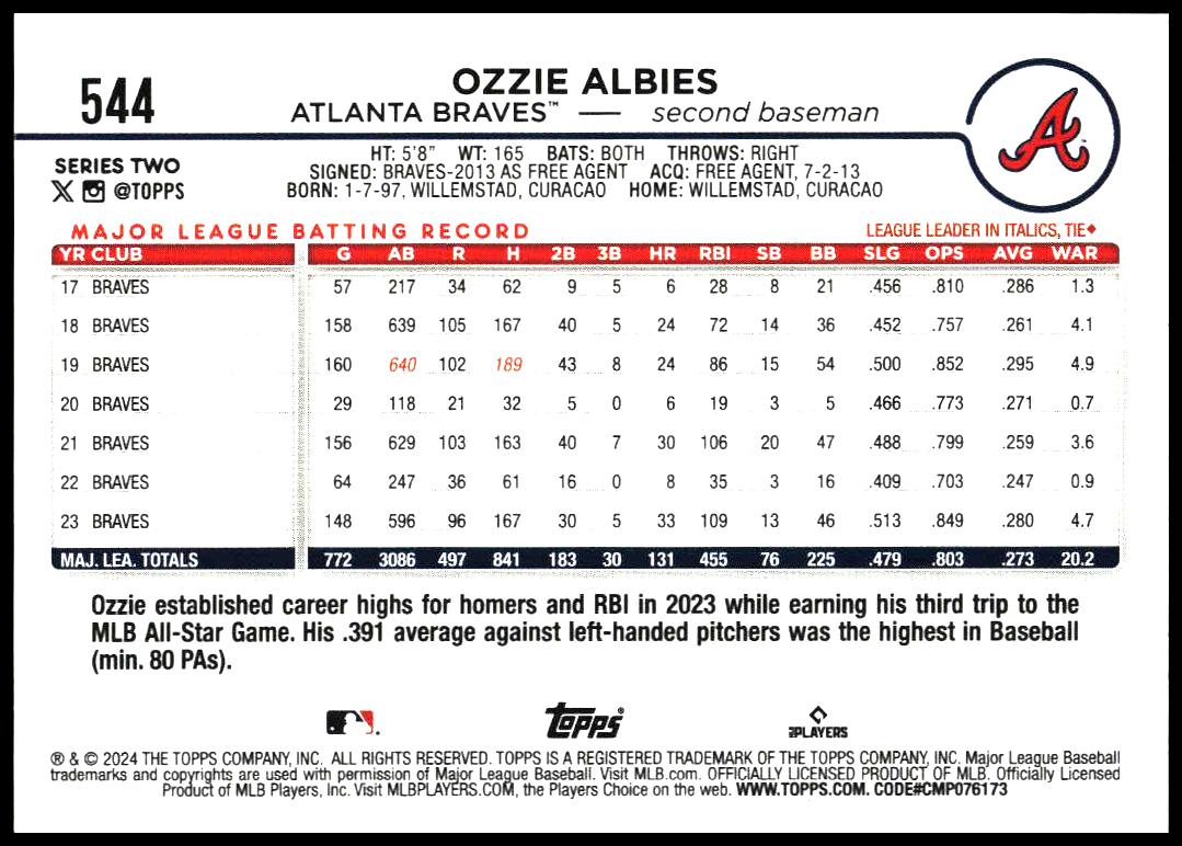 This BaseballΒ card, from 2024 is part of the Topps Series 2Β card set. Ozzie Albies is featured and has a card number of 544.