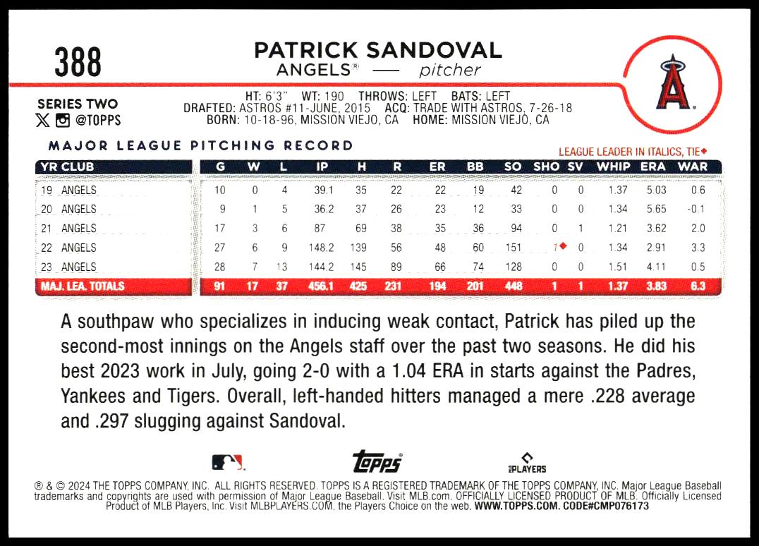 This Baseball card, from 2024 is part of the Topps Series 2 card set. Patrick Sandoval is featured and has a card number of 388.