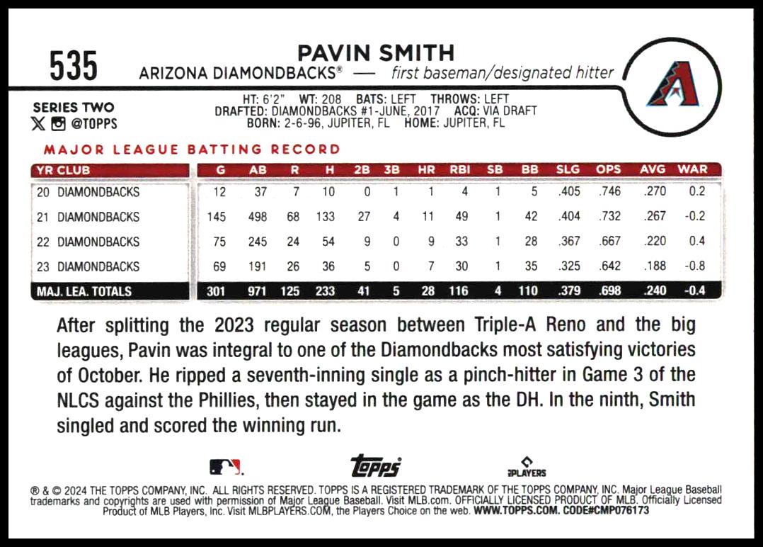 This Baseball card, from 2024 is part of the Topps Series 2 card set. Pavin Smith is featured and has a card number of 535.