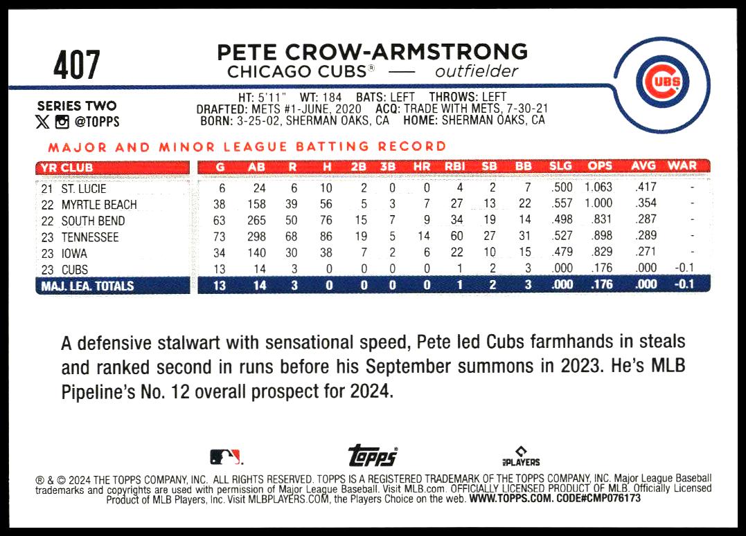 This Baseball card, from 2024 is part of the Topps Series 2 card set. Pete Crow-Armstrong is featured and has a card number of 407.