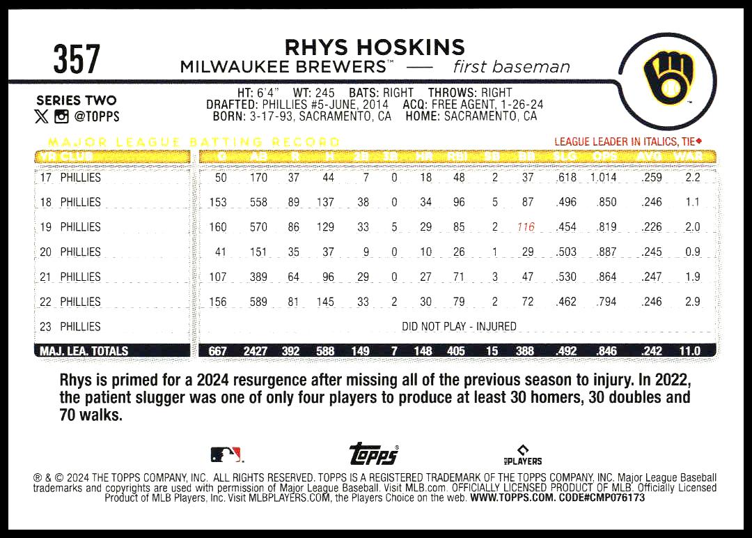 This BaseballΒ card, from 2024 is part of the Topps Series 2Β card set. Rhys Hoskins is featured and has a card number of 357.