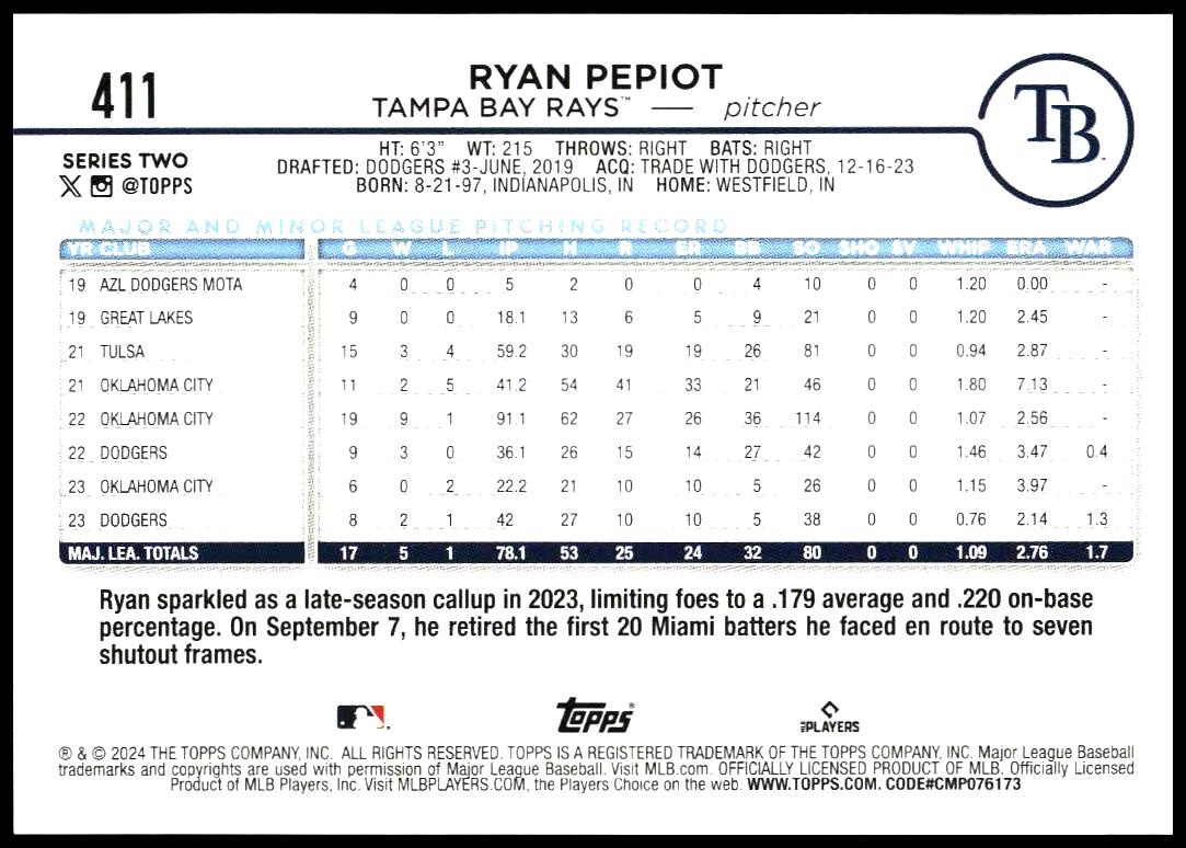 This BaseballΒ card, from 2024 is part of the Topps Series 2Β card set. Ryan Pepiot is featured and has a card number of 411.