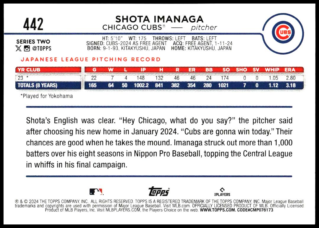 This Baseball card, from 2024 is part of the Topps Series 2 card set. Shota Imanaga is featured and has a card number of 442.