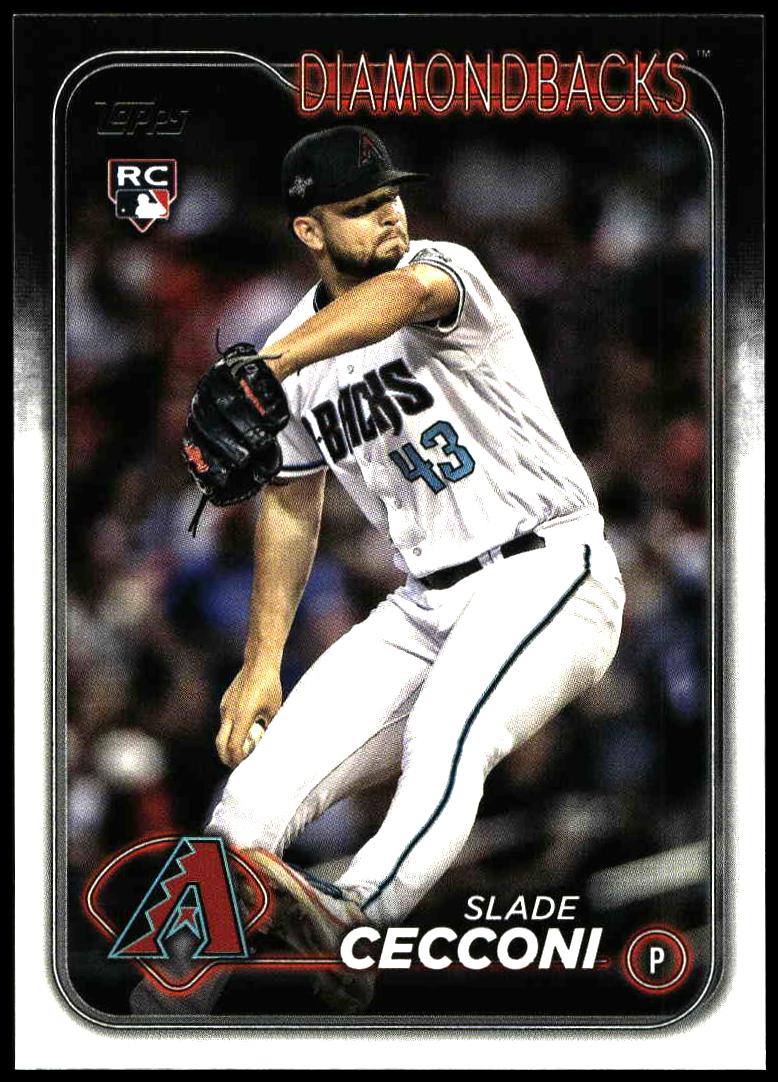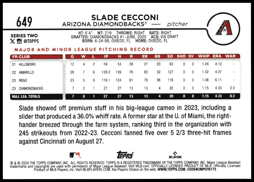 This Baseball card, from 2024 is part of the Topps Series 2 card set. Slade Cecconi is featured and has a card number of 649.
