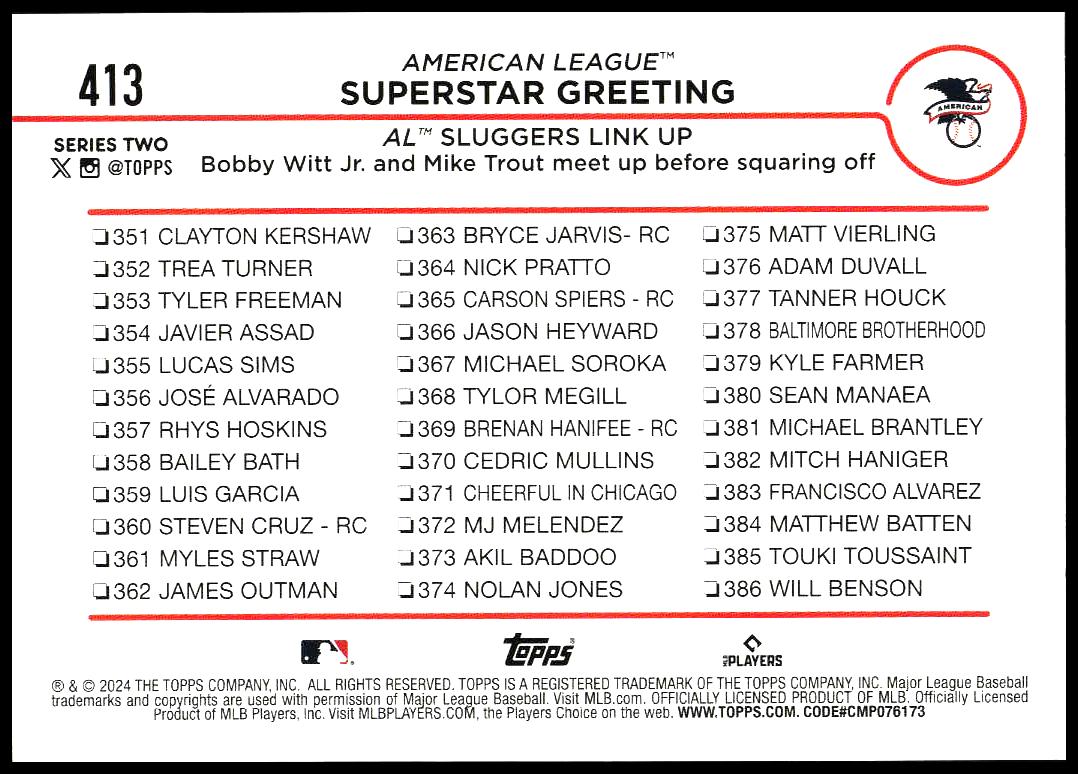 This Baseball card, from 2024 is part of the Topps Series 2 card set. Superstar Greeting is featured and has a card number of 413.