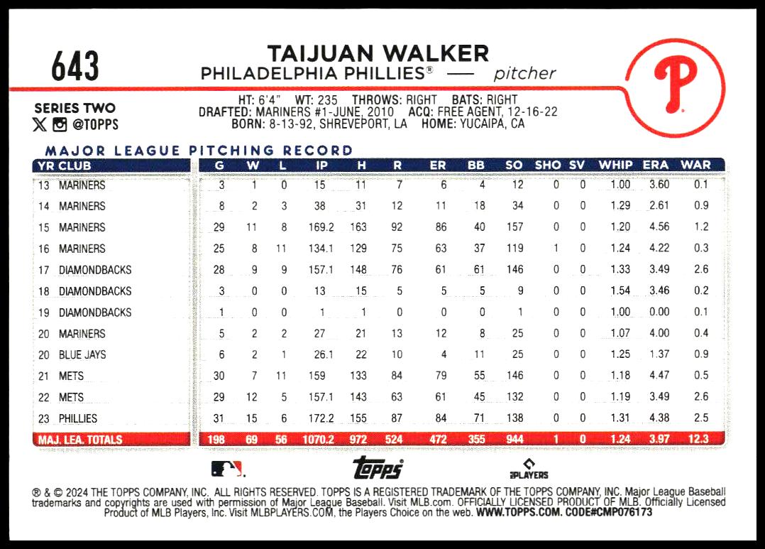This BaseballΒ card, from 2024 is part of the Topps Series 2Β card set. Taijuan Walker is featured and has a card number of 643.
