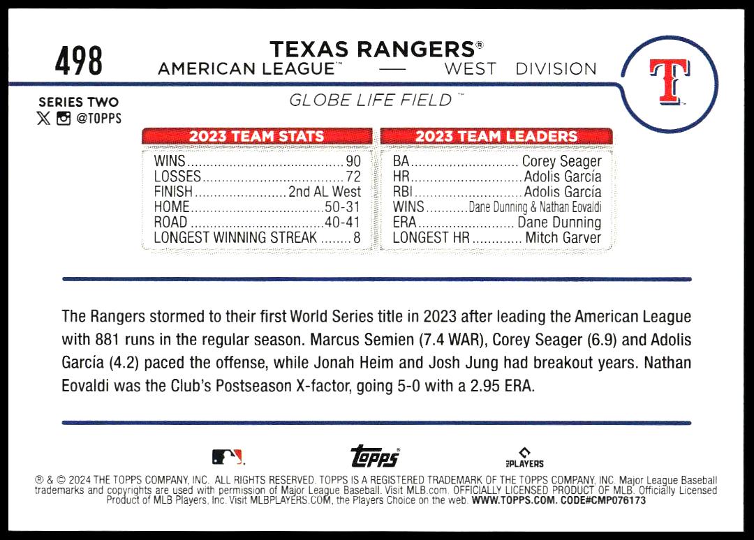 This Baseball card, from 2024 is part of the Topps Series 2 card set. Texas Rangers is featured and has a card number of 498.