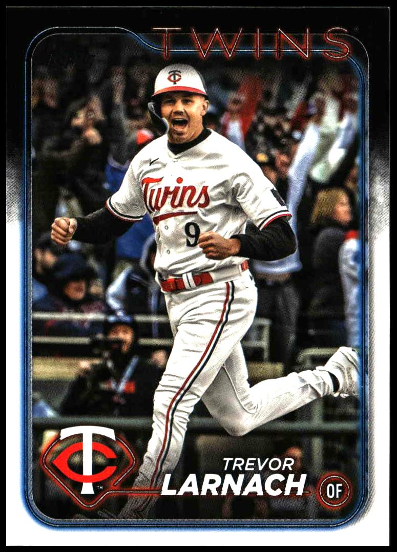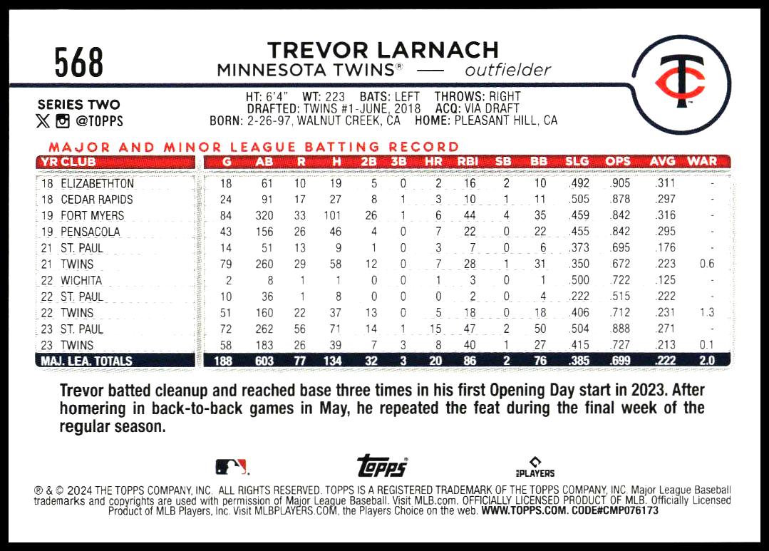 This Baseball card, from 2024 is part of the Topps Series 2 card set. Trevor Larnach is featured and has a card number of 568.
