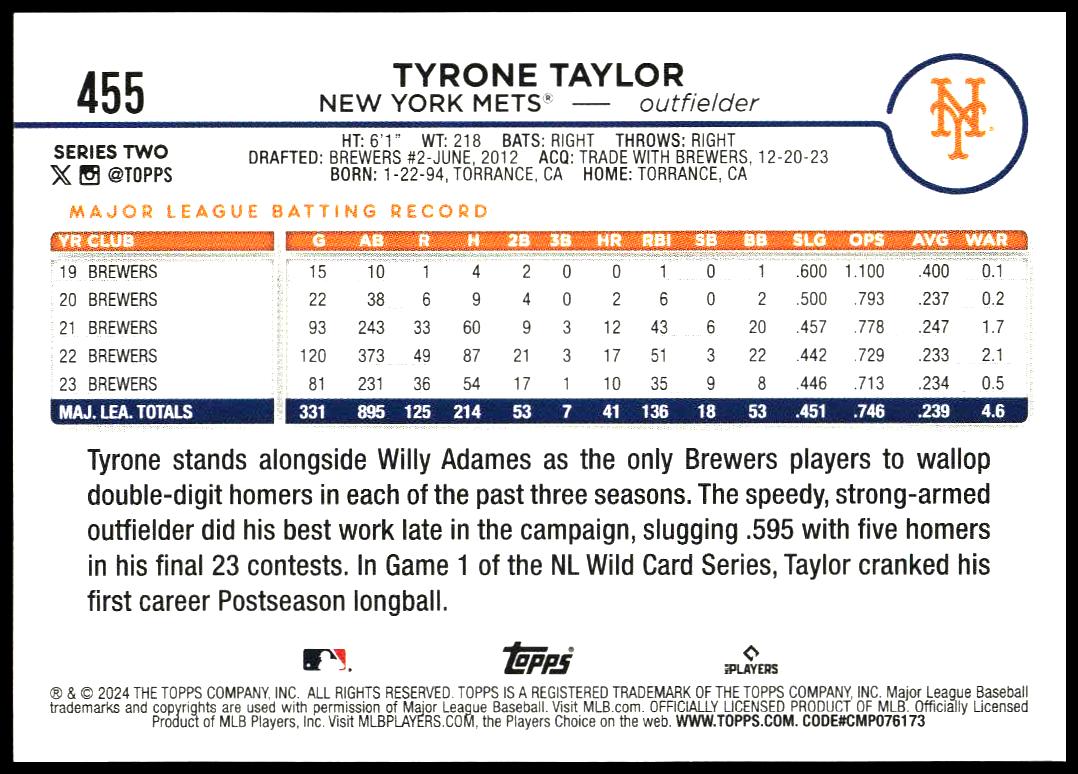 This Baseball card, from 2024 is part of the Topps Series 2 card set. Tyrone Taylor is featured and has a card number of 455.