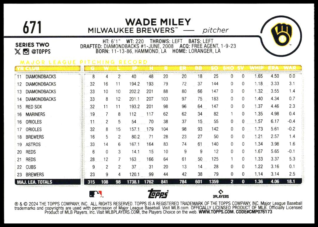 This BaseballΒ card, from 2024 is part of the Topps Series 2Β card set. Wade Miley is featured and has a card number of 671.