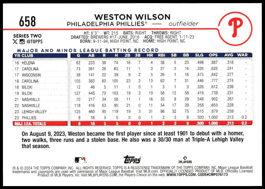 This Baseball card, from 2024 is part of the Topps Series 2 card set. Weston Wilson is featured and has a card number of 658.