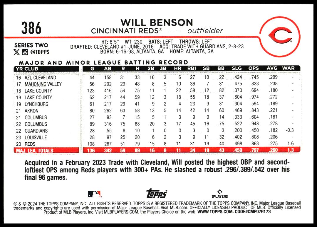 This Baseball card, from 2024 is part of the Topps Series 2 card set. Will Benson is featured and has a card number of 386.
