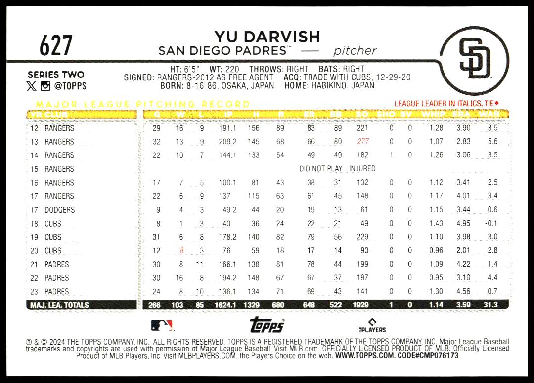 This BaseballΒ card, from 2024 is part of the Topps Series 2Β card set. Yu Darvish is featured and has a card number of 627.