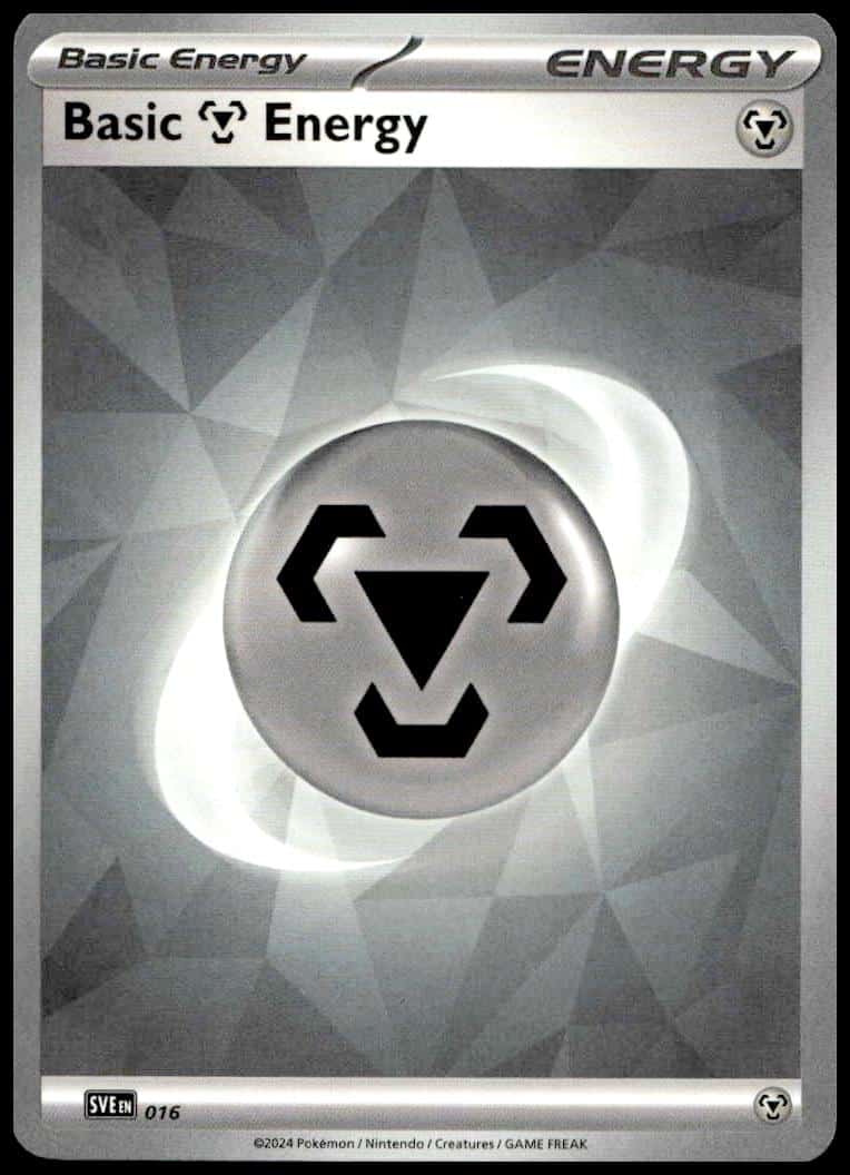 This Pokémon card, from 2025 is part of the Pokémon Scarlet & Violet: Prismatic Evolutions card set. Basic Metal Energy is featured and has a card number of 016.