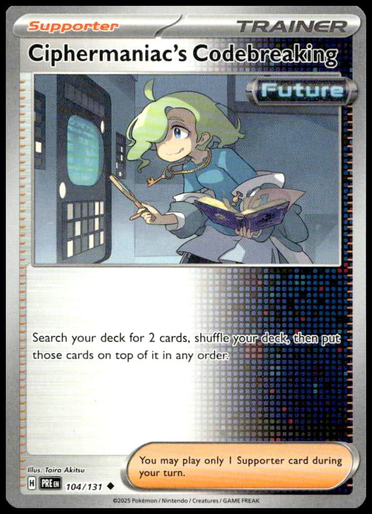 This Pokémon card, from 2025 is part of the Pokémon Scarlet & Violet: Prismatic Evolutions card set. Ciphermaniac’s Codebreaking is featured and has a card number of 104/131.