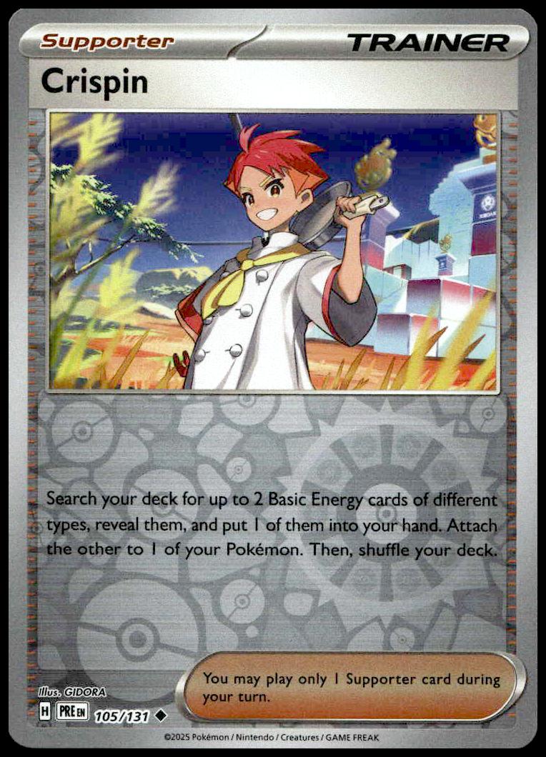 This Pokémon card, from 2025 is part of the Pokémon Scarlet & Violet: Prismatic Evolutions card set. Crispin is featured and has a card number of 105/131.