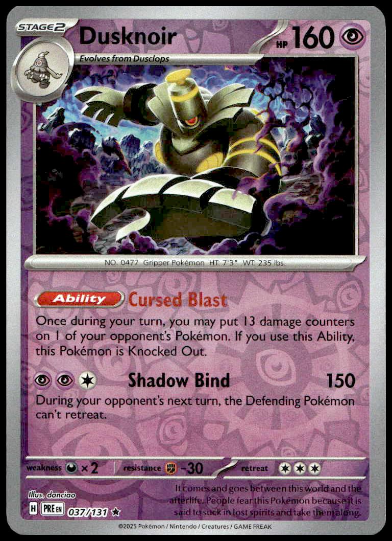 This Pokémon card, from 2025 is part of the Pokémon Scarlet & Violet: Prismatic Evolutions card set. Dusknoir is featured and has a card number of 037/131.