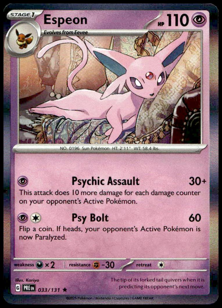 This Pokémon card, from 2025 is part of the Pokémon Scarlet & Violet: Prismatic Evolutions card set. Espeon is featured and has a card number of 033/131.