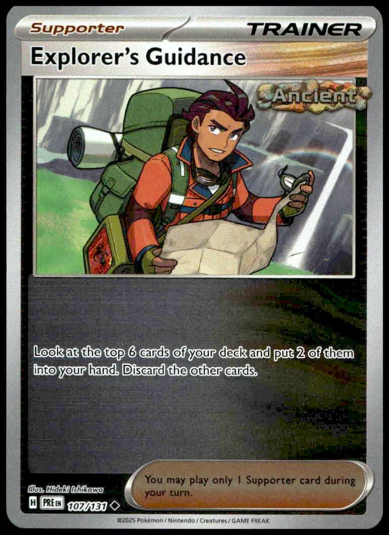 This Pokémon card, from 2025 is part of the Pokémon Scarlet & Violet: Prismatic Evolutions card set. Explorer’s Guidance is featured and has a card number of 107/131.