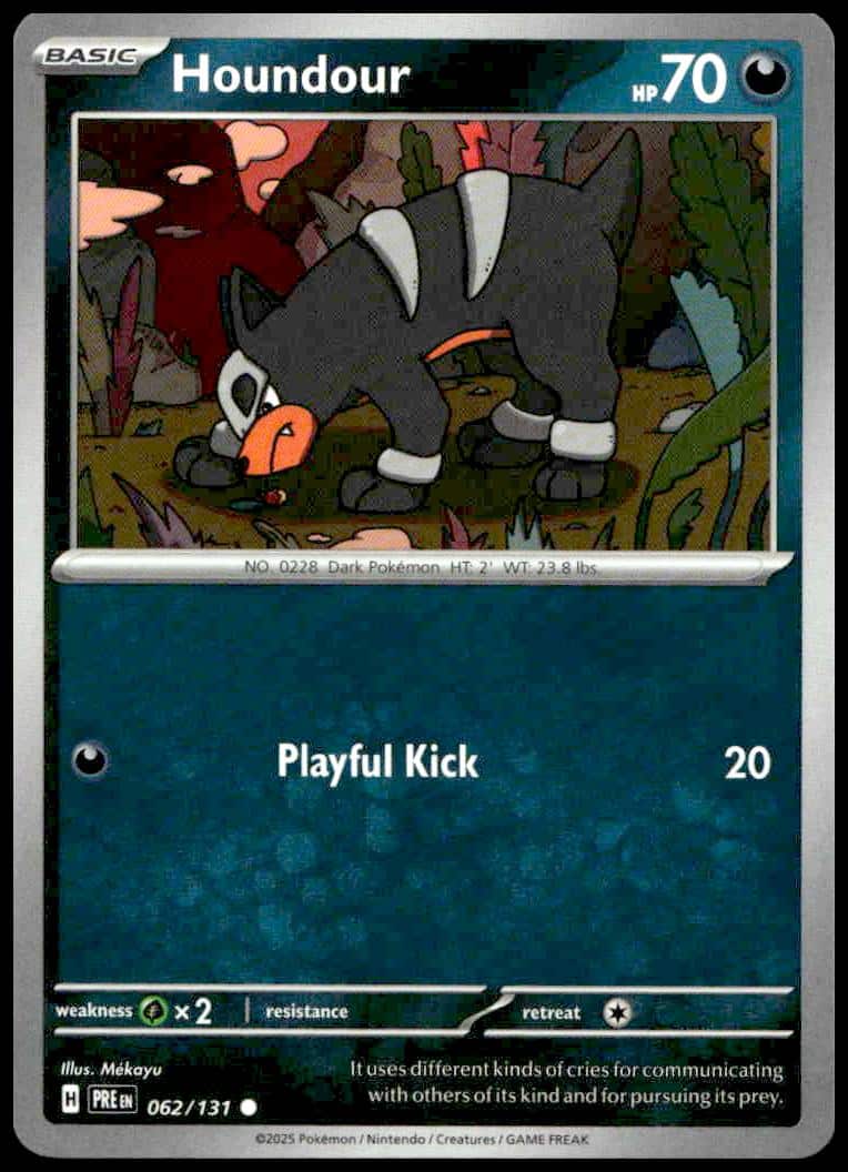 This Pokémon card, from 2025 is part of the Pokémon Scarlet & Violet: Prismatic Evolutions card set. Houndour is featured and has a card number of 062/131.