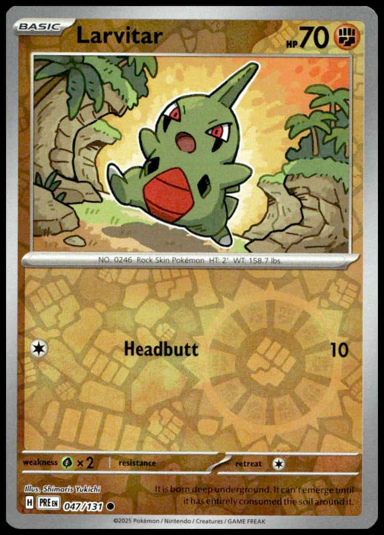 This Pokémon card, from 2025 is part of the Pokémon Scarlet & Violet: Prismatic Evolutions card set. Larvitar is featured and has a card number of 047/131.