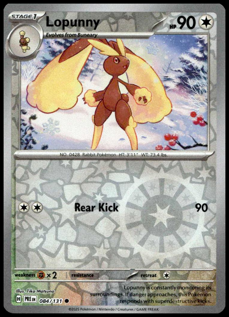 This Pokémon card, from 2025 is part of the Pokémon Scarlet & Violet: Prismatic Evolutions card set. Lopunny is featured and has a card number of 084/131.