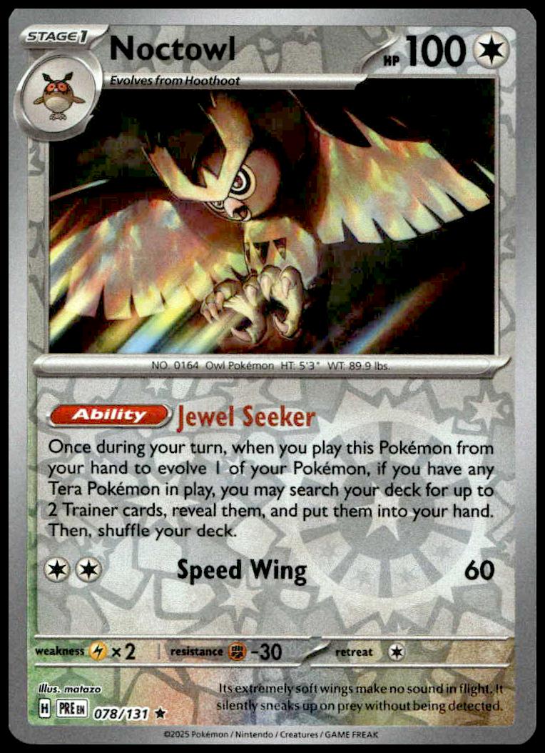 This Pokémon card, from 2025 is part of the Pokémon Scarlet & Violet: Prismatic Evolutions card set. Noctowl is featured and has a card number of 078/131.