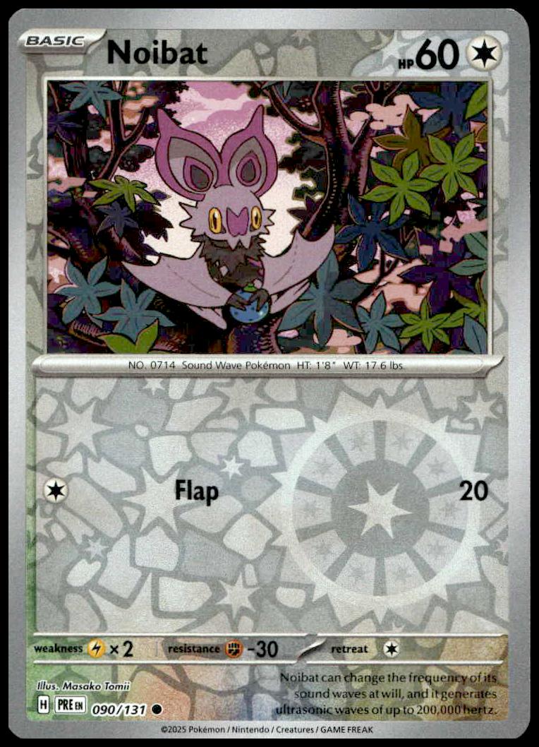This Pokémon card, from 2025 is part of the Pokémon Scarlet & Violet: Prismatic Evolutions card set. Noibat is featured and has a card number of 090/131.