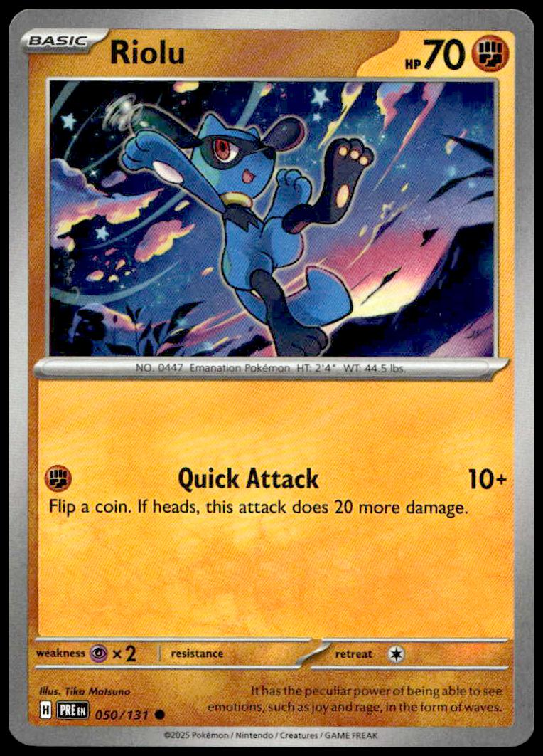 This Pokémon card, from 2025 is part of the Pokémon Scarlet & Violet: Prismatic Evolutions card set. Riolu is featured and has a card number of 050/131.
