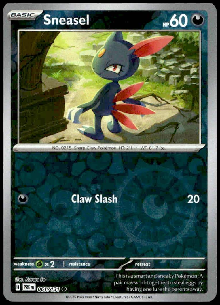 This Pokémon card, from 2025 is part of the Pokémon Scarlet & Violet: Prismatic Evolutions card set. Sneasel is featured and has a card number of 061/131.