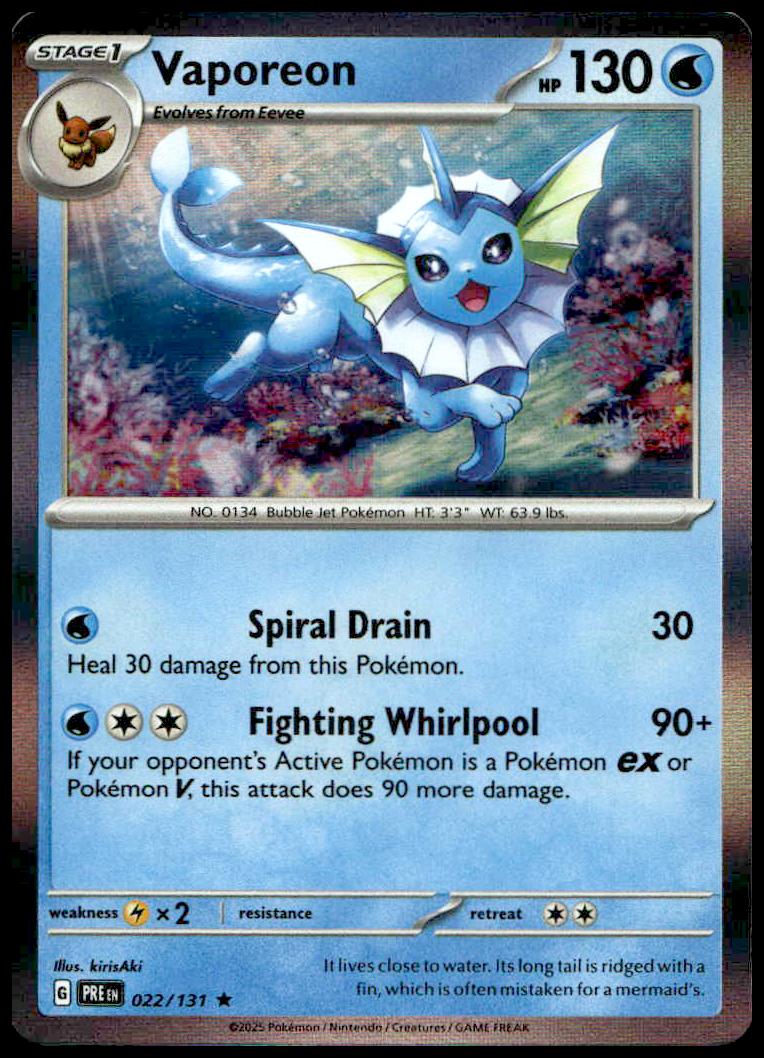 This Pokémon card, from 2025 is part of the Pokémon Scarlet & Violet: Prismatic Evolutions card set. Vaporeon is featured and has a card number of 022/131.